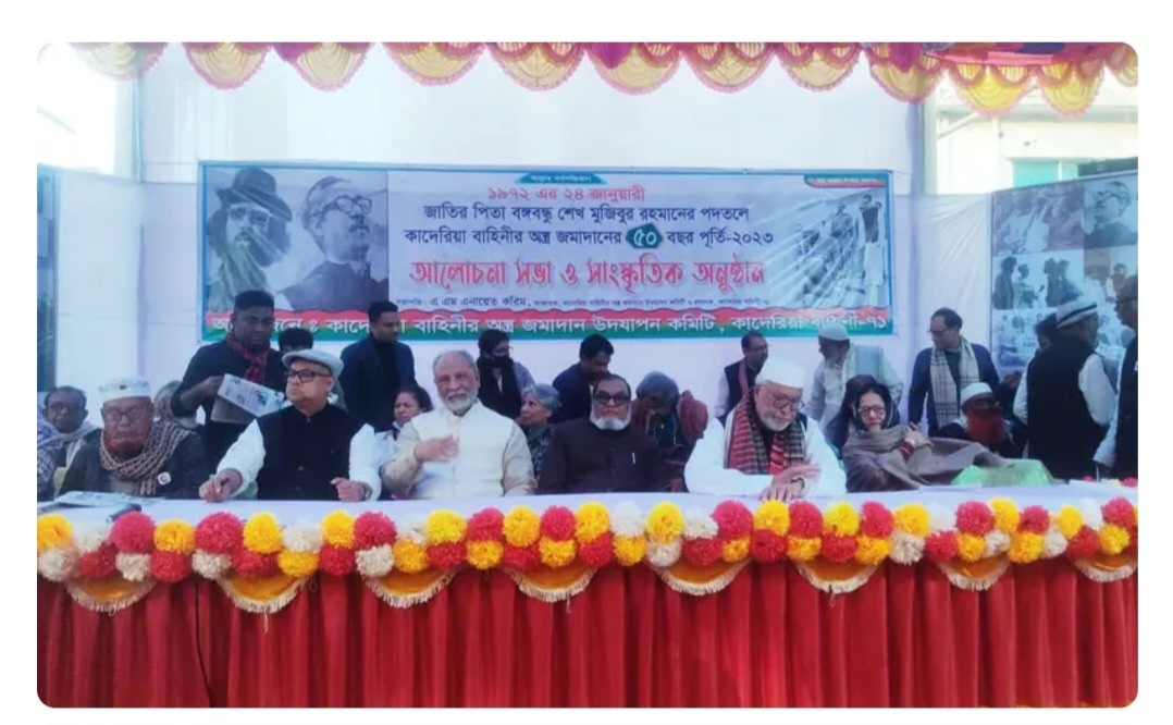 কা‌দে‌রিয়া বা‌হিনীর অস্ত্র জমাদানের ৫০ বছর উদযাপন ক‌মি‌টির সভাপ‌তি এ এম এনা‌য়েত করিমের সভাপ‌তি‌ত্বে অনুষ্ঠা‌নে প্রধান অতি‌থি ছি‌লেন মু‌ক্তি‌যুদ্ধ বিষয়ক মন্ত্রী আ ক ম মোজা‌ম্মেল হক।